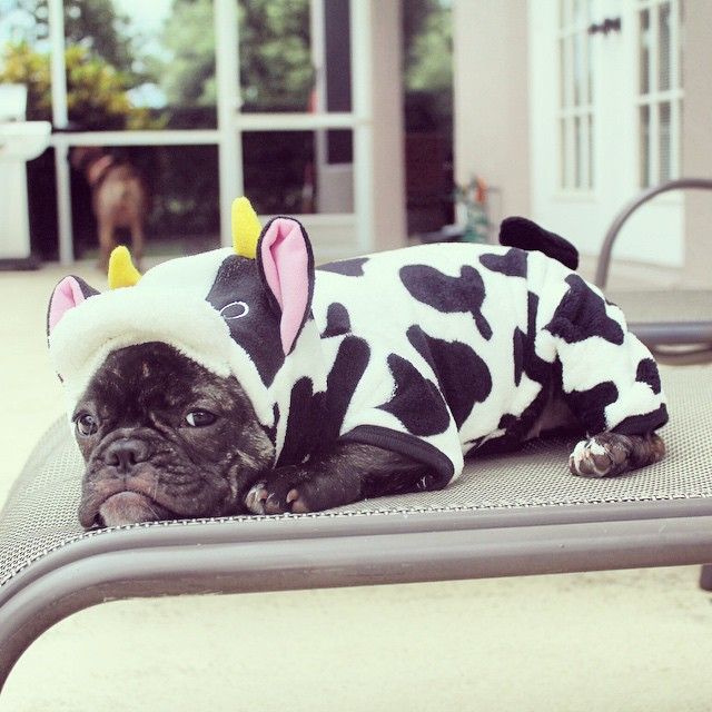 Dress your little Frenchie up in a Cow French Bulldog Costume. This dog costume is made with 100% cotton and Velcro closure for easy dressing.