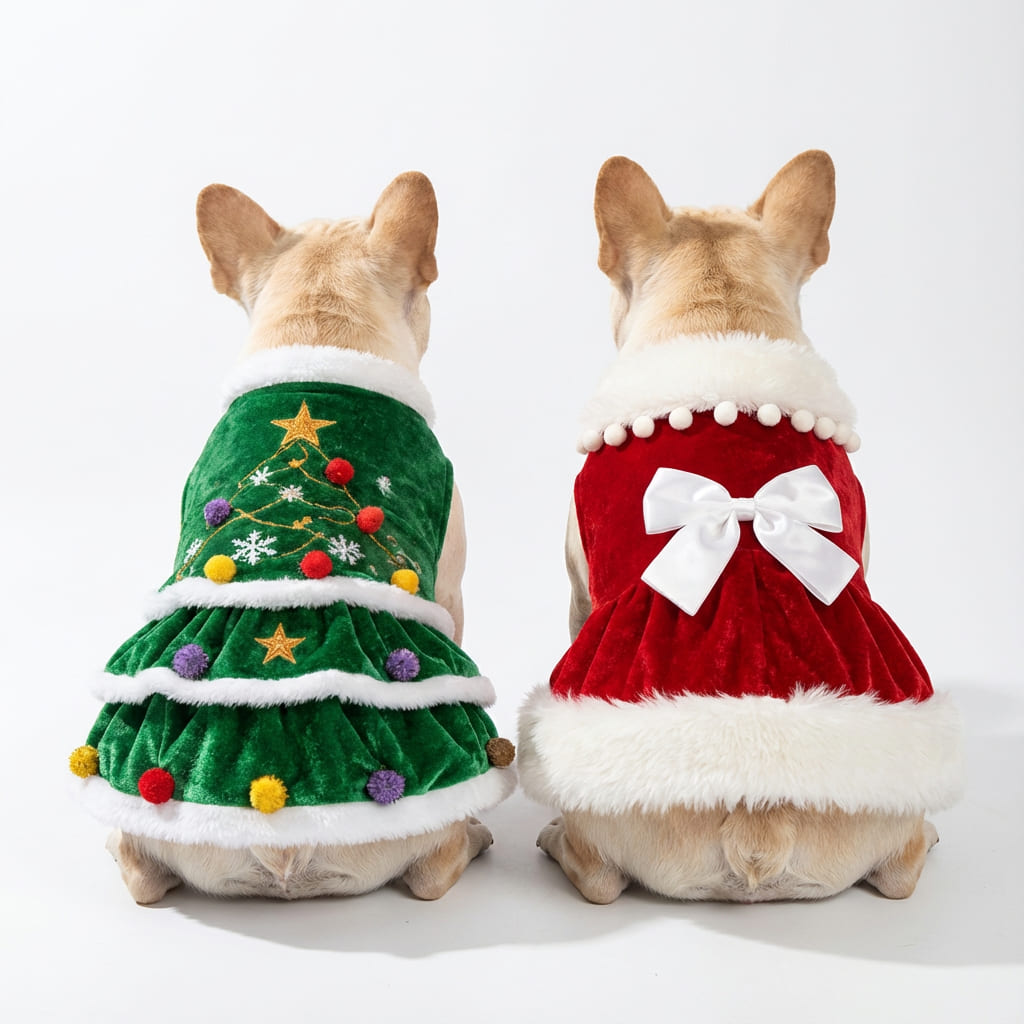 Make your holiday photos unforgettable with this adorable French Bulldog Christmas Dress Costume. a festive, comfortable, and eye-catching outfit designed specifically for the unique body shape of French Bulldogs. Featuring soft velvet fabric, fluffy faux-fur trim, and charming Christmas details, this costume turns your Frenchie into the cutest holiday star.