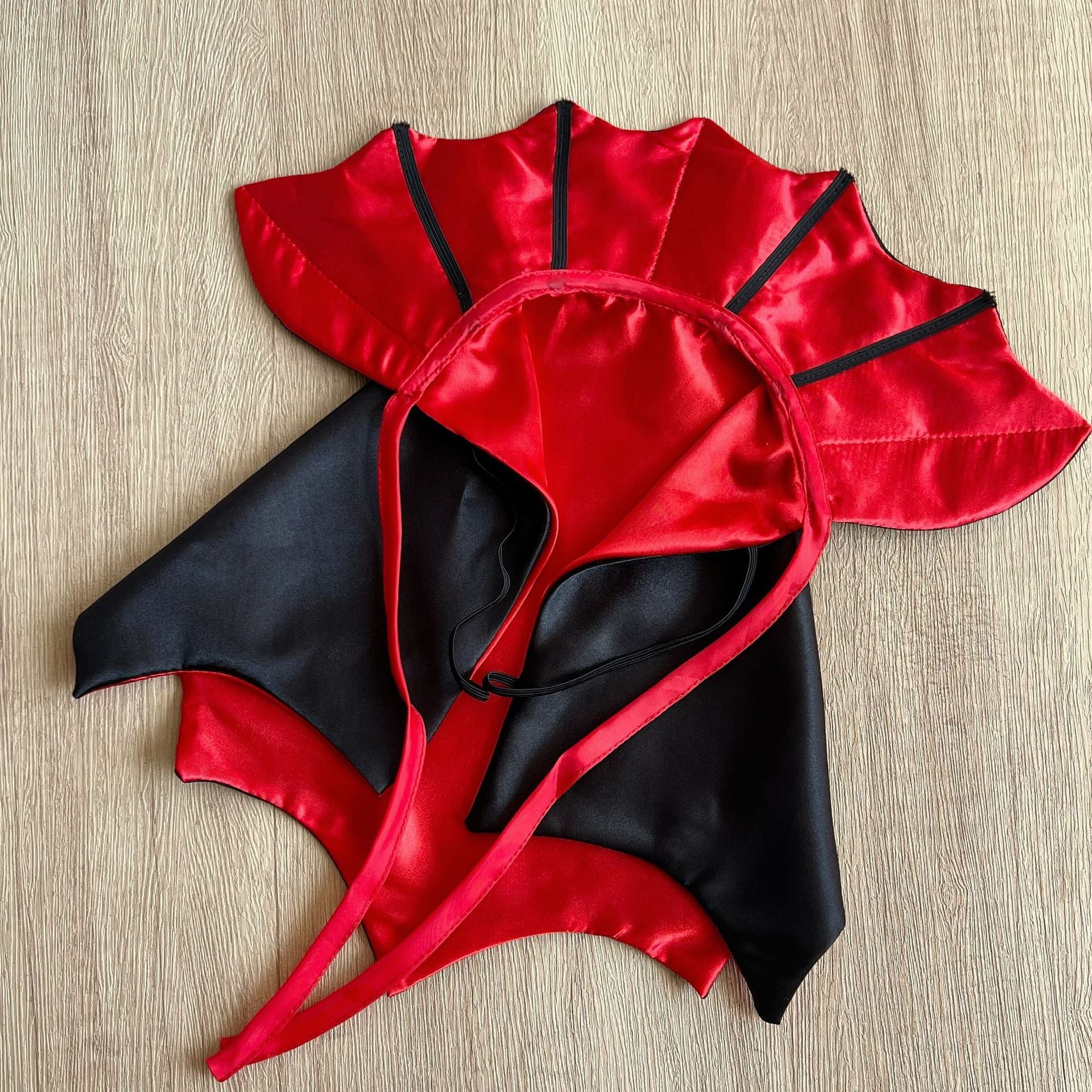 Crafted from lightweight and pet-friendly fabric, the cloak features a striking black-and-red design with a high vampire collar and ribbon tie for a secure fit. The free-size design (36 cm length / 14.17 in, 54 cm width / 21.26 in, 14 cm collar width / 5.51 in) ensures it fits most French Bulldogs and similar breeds.