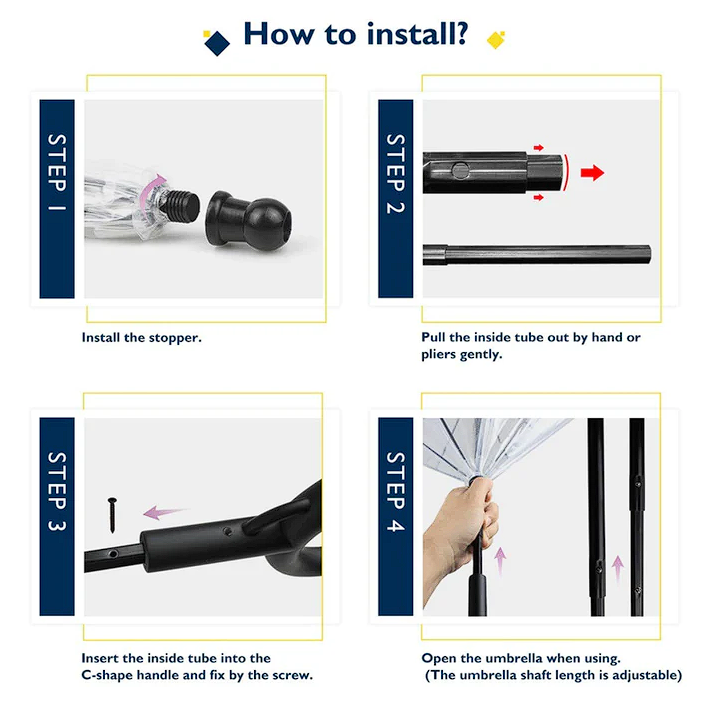 Tighten the umbrella cap, then pull the inside tube out with your hand or pliers. Insert the inside tube into the handle and secure it with one screw, then open and enjoy this dog umbrella.
